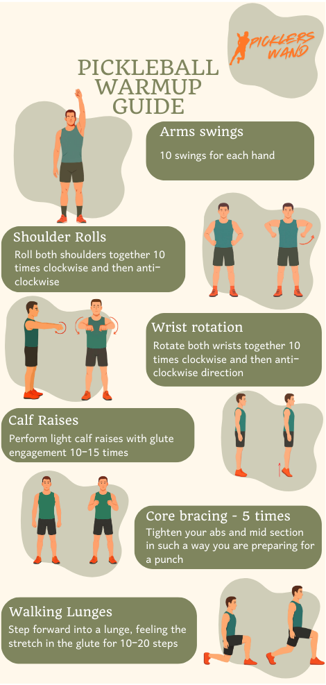 While warming-up for Pickleball, you should choose appropriate exercises. Jogging or stretching might warm up your body, but it doesn’t prepare your body for Pickleball game.
